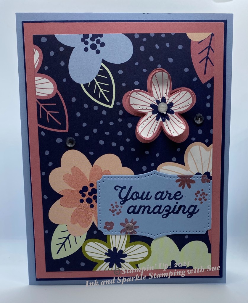 Today at 1:00 pm MDT,, I was on FaceBook at Ink and Sparkle Stamping with Sue doing my Wednesday Live video. I randomly chose 3 Stampin’ Up! products + 2 Stampin’ Up! products + 1 Stampin’ Up! product and make a project (see why I call these posts 3-2-1 Stamp?). This week I chose 3 pieces of Designer Series Paper (DSP), 2 card stock layers and 1 stamp.