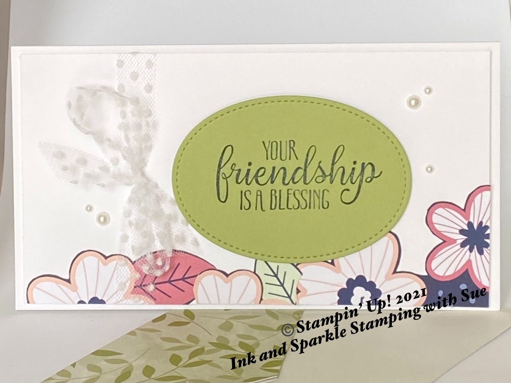 Today at 1:00 pm MDT,, I was on FaceBook at Ink and Sparkle Stamping with Sue doing my Wednesday Live video. I randomly chose 3 Stampin’ Up! products + 2 Stampin’ Up! products + 1 Stampin’ Up! product and make a project (see why I call these posts 3-2-1 Stamp?). This week I chose 3 pieces of Designer Series Paper (DSP), 2card stock layers and 1stamp.