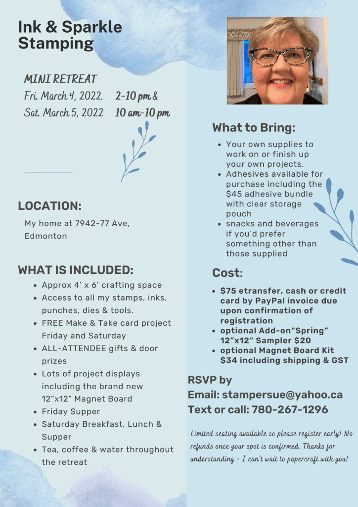 So … save the above dates and watch for registration posts here and on Facebook: Ink and Sparkle Stamping with Sue
